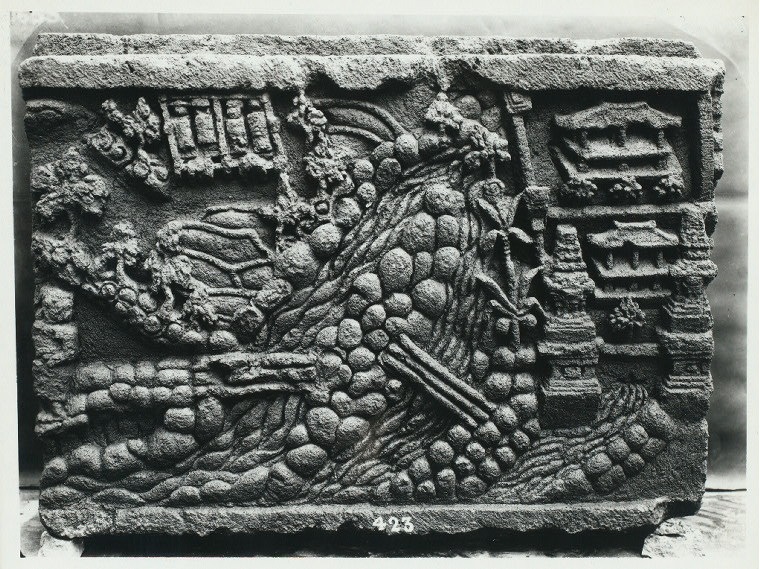 Java, East: Antiquities. Trowulan [town]: Relief showing bird's-eye-view of village (?) or cemetery (?), rice fields near a meandering river crossed by bridges, and a temple court, from Trawulan, Modjokerto, in Modjokerto Museum, height 26.4 The New York Public Library Digital Collections