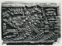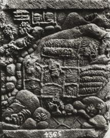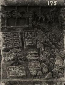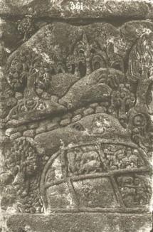 Java, East: Antiquities. Trowulan [town]: Relief showing bird's-eye-view of village (?) or cemetery (?), rice fields near a meandering river crossed by bridges, and a temple court, from Trawulan, ...