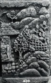 Java, East: Antiquities. Trowulan [town]: Relief showing bird's-eye-view of village (?) or cemetery (?), rice fields near a meandering river crossed by bridges, and a temple court, from Trawulan, ...
